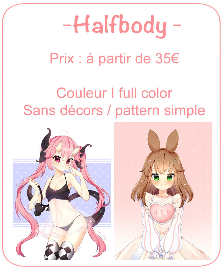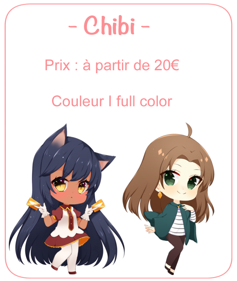 Envoyez moi un mail à [email protected] avec le type de commission souhaité en vous basant sur les fiches ci-dessous, ainsi qu'avec toutes les informations détaillant votre ou vos personnages. Un devis adapté à votre demande vous sera transmis.Prenez le temps d'écrire votre message. Plus vous serez clair, plus ce sera facile et rapide de prendre en compte votre demande.